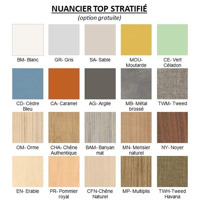 Top stratifié (option gratuite, non compatible avec la serrure) : 20 coloris