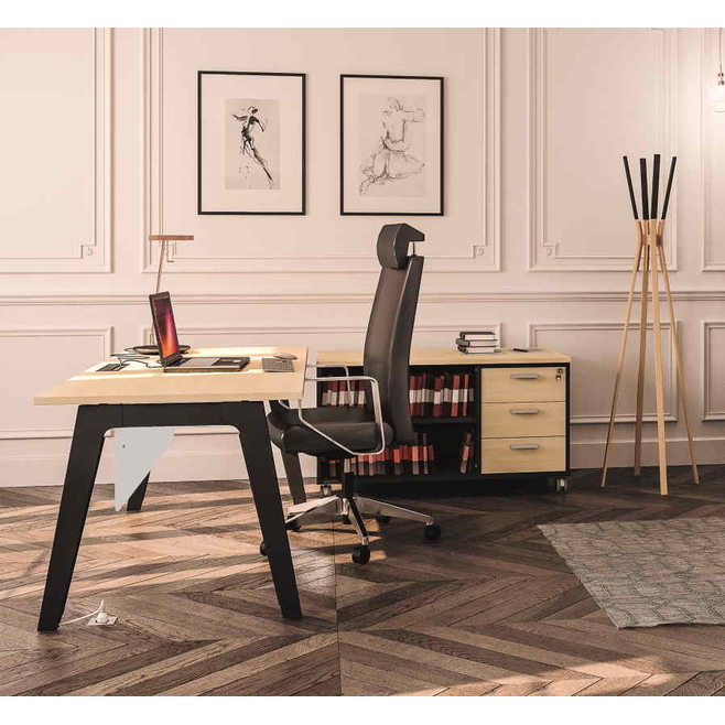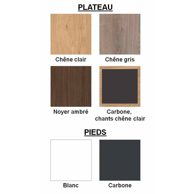 Plateau : Chêne clair, Chêne gris, Noyer ambré, chants assortis, ou Carbone avec chants chêne clair.