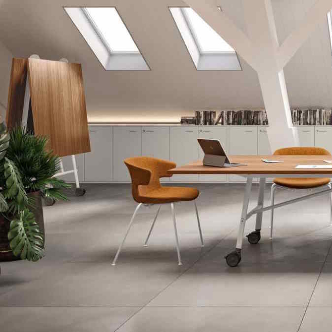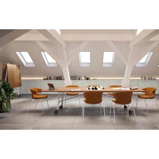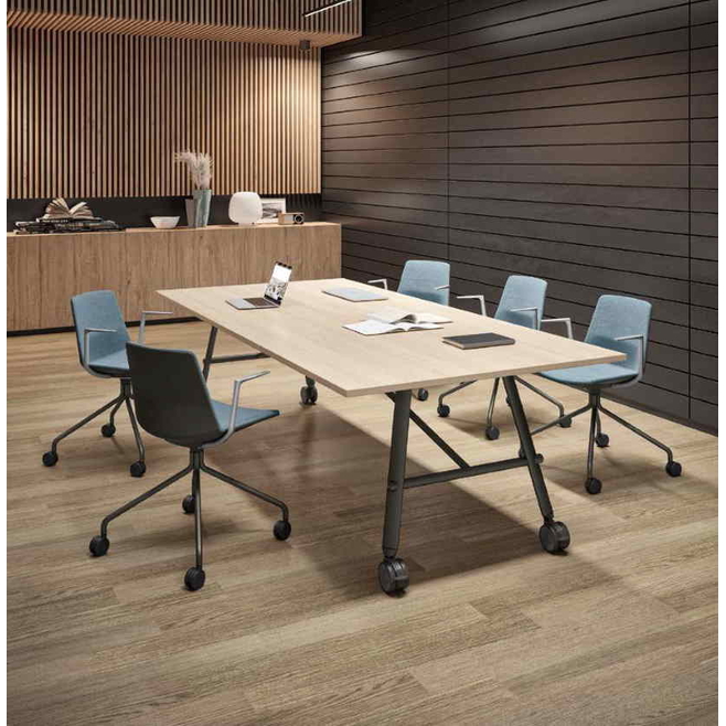 SERENITY est une table au plateau pliable et rabattable dans la longueur, ce qui permet de fermer la table rapidement et de la ranger facilement.