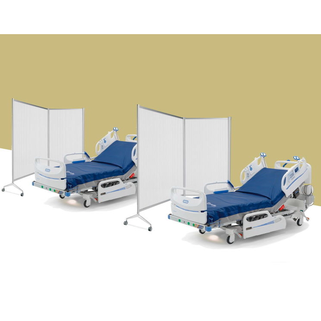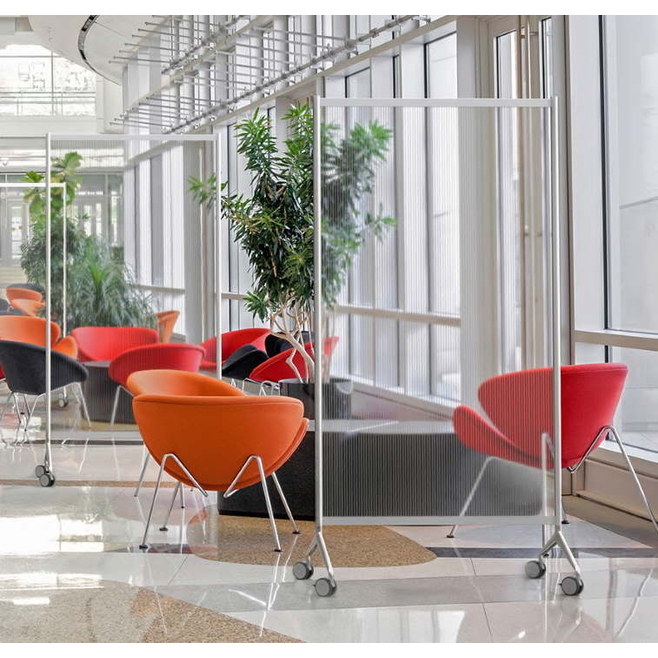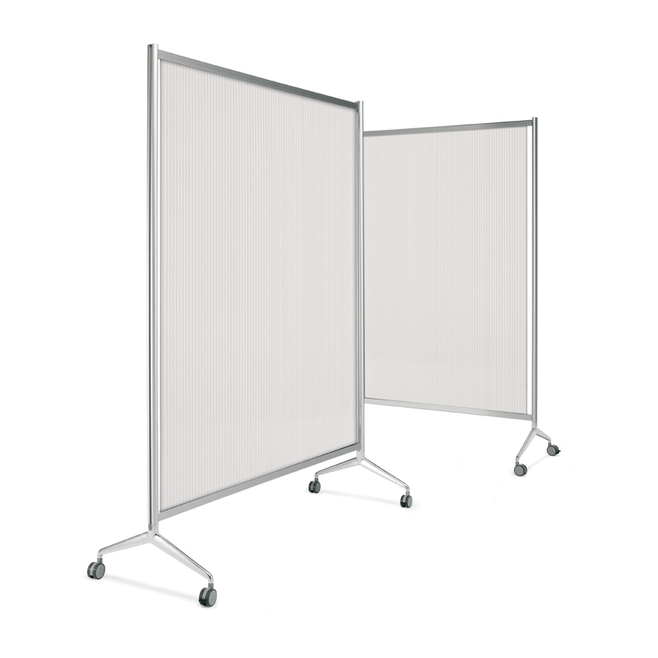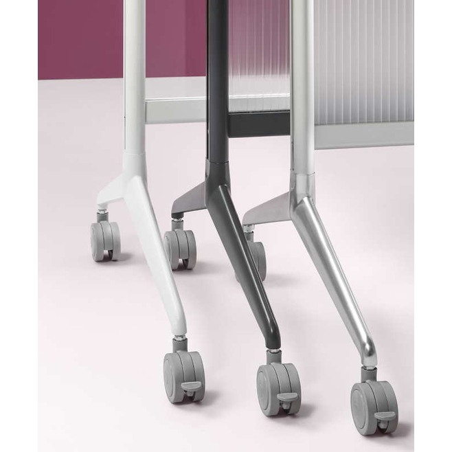 Système de cloison modulaire sur cadre en aluminium et pieds équipés de roulettes et de freins.